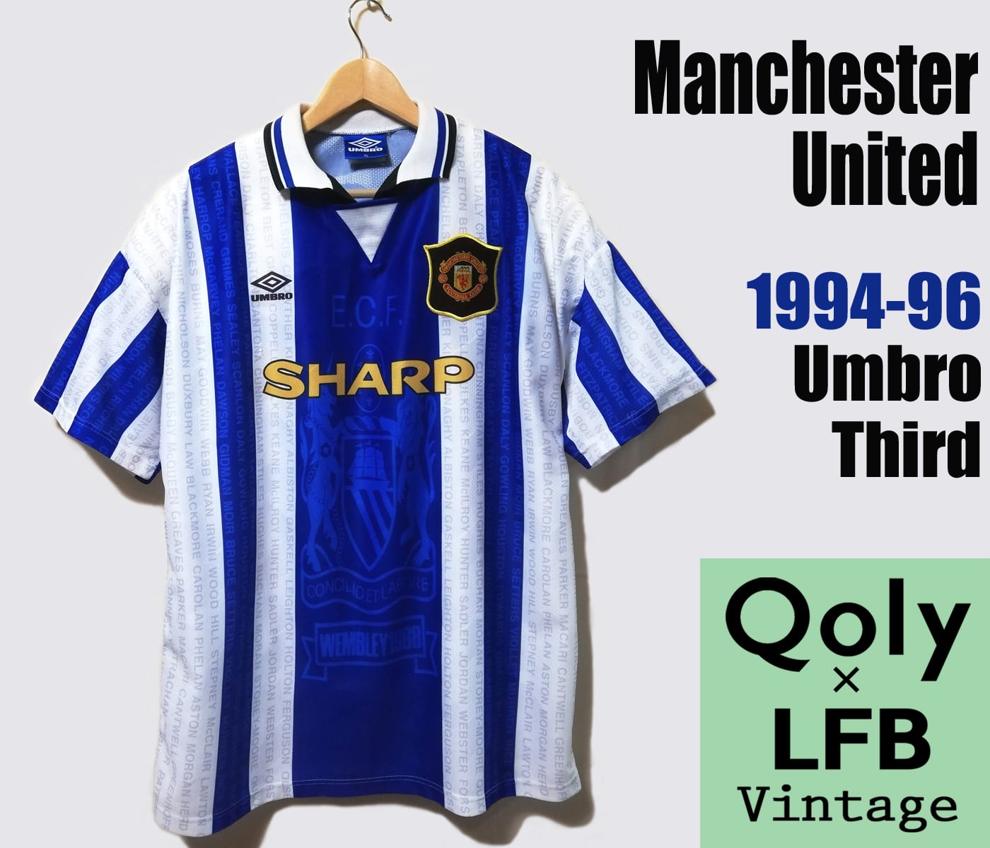 【メーカー/シーズン/モデル】 古着/Used Jersey Umbro(アンブロ) 1994-96 サードユニフォーム ----------------------------- 当商品は古着ユニフォームです。 掲載画像の商品をお届けいたします。 少しでも良い状態でお届けするために、商品にダメージを与えない範囲内で可能な限り【汚れ、シワ、毛玉などの除去】【クリーニング】を行っています。 ◆ご注文の際はお得な割引きクーポンをぜひご利用ください。 ----------------------------- 【ユニフォームについて】 マンチェスター・ユナイテッドの古着ユニフォーム。1994-95、95-96の2シーズンで使用したサードユニフォームです。 第3ユニフォームという位置付けながら、現在でも極めて高い人気を誇る一着。それはこのユニフォームのデザインと着用した試合が大きく関係しています。 94-95シーズンはプレミアリーグを2位で終えましたが、95-96シーズンは見事に優勝。その優勝を決めたミドルスブラ戦で着用したのが、このサードでした。 青と白のストライプ柄は1900年代初期に使用したユニフォームに着想を得たデザイン。 シャツに落とし込んだ文字は1994年時点での過去の所属選手の名前で、カントナやギグスといった当時の所属選手の名前も見られます。 前面と背面のグラフィックは、1967-68シーズンのチャンピオンズカップ(現CL)決勝戦で着用したユニフォームのエンブレム。 1968年5月29日。聖地ウェンブリーでの決勝戦で青いユニフォームを着たユナイテッドは4-1でベンフィカを撃破し、クラブ史上初の国際タイトルを獲得しました。 過去の栄光の象徴をデザインしたユニフォームでタイトルを獲得。このことから現在でもユナイテッドファンに高い人気を誇ります。 ちなみに94-96モデルでありながら、実は96-97シーズンでもサウサンプトン戦の1試合のみ着用しました。 ●エンブレムはワッペン縫い付け。 ●胸のUmbroロゴと胸の「SHARP」は昇華プリント。 胸の「SHARP」は1982-83シーズンから1999-2000シーズンまでの18年間をパートナーとしてともに歩んだ“初代”胸スポンサー。90年代のユナイテッドを象徴するロゴマークです。 袖から脇にかけて弧を描くような「R」のシルエットは90年代Umbroキットの特徴で、当時物だからこそ得られるレトロ感。 94-96の2シーズンのみ各キットで使用した盾形のエンブレムも独特の雰囲気があります。 文字通り「90年代黄金期」のユニフォーム。デザインやエピソードからユナイテッドを語る上で欠かせない一着。 コンディションは良好につき、コレクションにおすすめです。 【当時の所属選手】 ピーター・シュマイケル(GK)、エリック・カントナ、ライアン・ギグス、ポール・インス、デニス・アーウィン、リー・シャープ、ガリー・パリスター、アンドレイ・カンチェルスキス、デヴィッド・ベッカムほか。 【商品の状態】 ・胸スポンサー「S」の上にツレ(内側に引っ掻き傷)が1か所。 ・襟内側の白いタブに色褪せ。 ・所々にいくつかの極めて軽微な小傷。 縫製不良、汚れといったダメージは見られません。 所々に見られる小傷は気にならない程度のもので、年代を考えるとコンディションは極めて良好です。 【サイズ(海外サイズ)】 ●インポートXL 丈:79cm(後ろ83cm) 幅:60cm 袖:45cm イングランド製/ポリエステル85% ※タブの色褪せで製造国を直接確認できませんが、当時のユニフォームはイングランド製です。 ------ 商品は欧州輸入品です。国内の買い取り品ではありません。