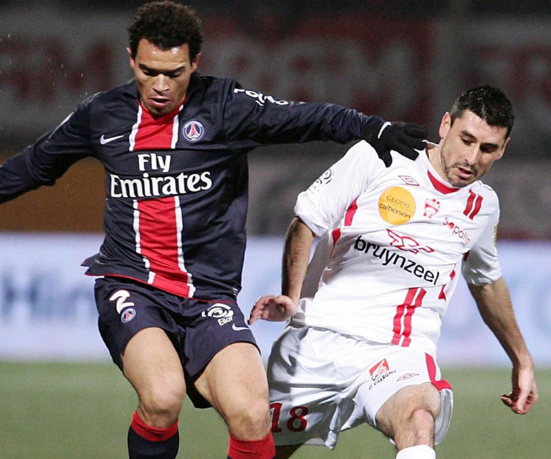 この写真は10-11シーズンのパリ・サンジェルマン戦。ナンシーの選手用ユニフォームはご覧の通りスポンサーロゴが多いものでした。当店在庫のレプリカとは見た目が違いすぎますね。