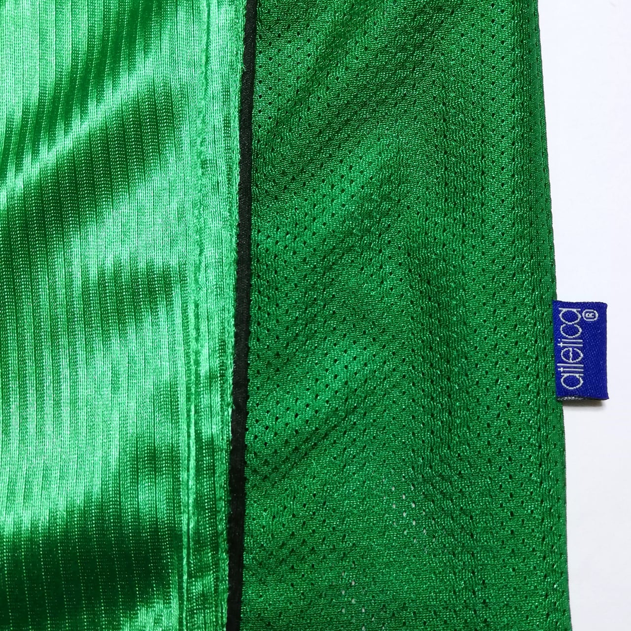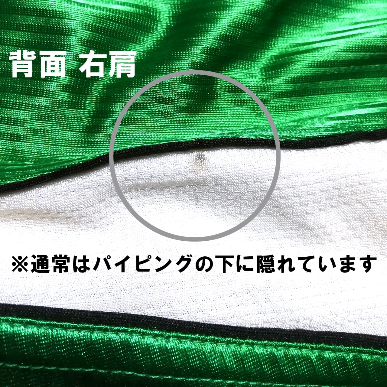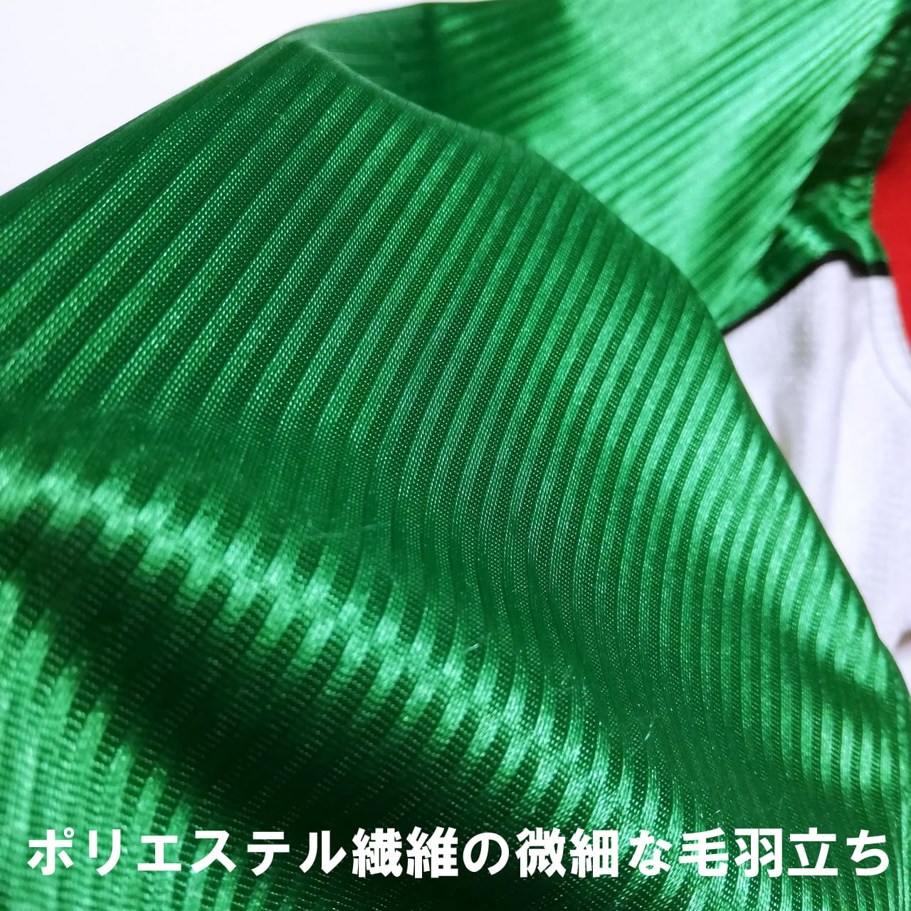 前述の通り、サッカーユニフォーム史上でも屈指と言える光沢感が特徴的。グリーン部分はジャガードでピンストライプを施し、美しさを際立たせます。