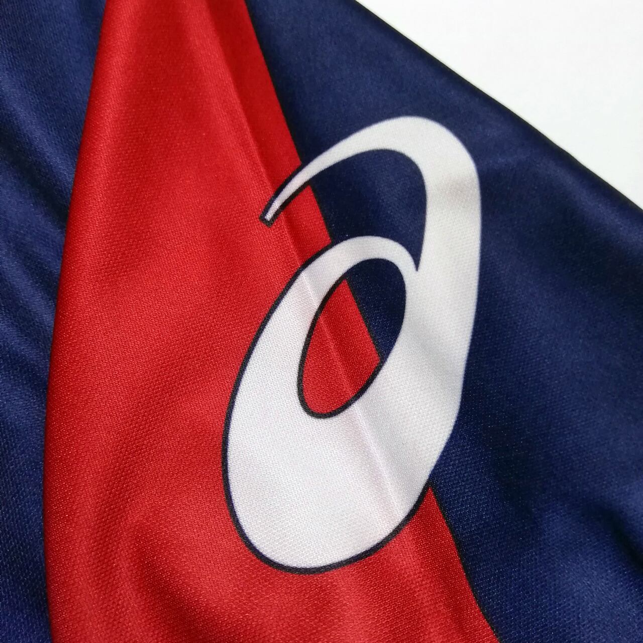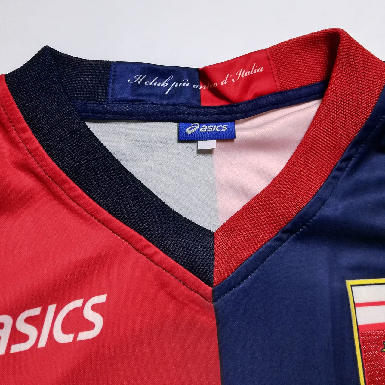 赤青半々のデザインはジェノアの鉄板スタイル。サプライヤーは日本のスポーツブランドAsics(アシックス)です。