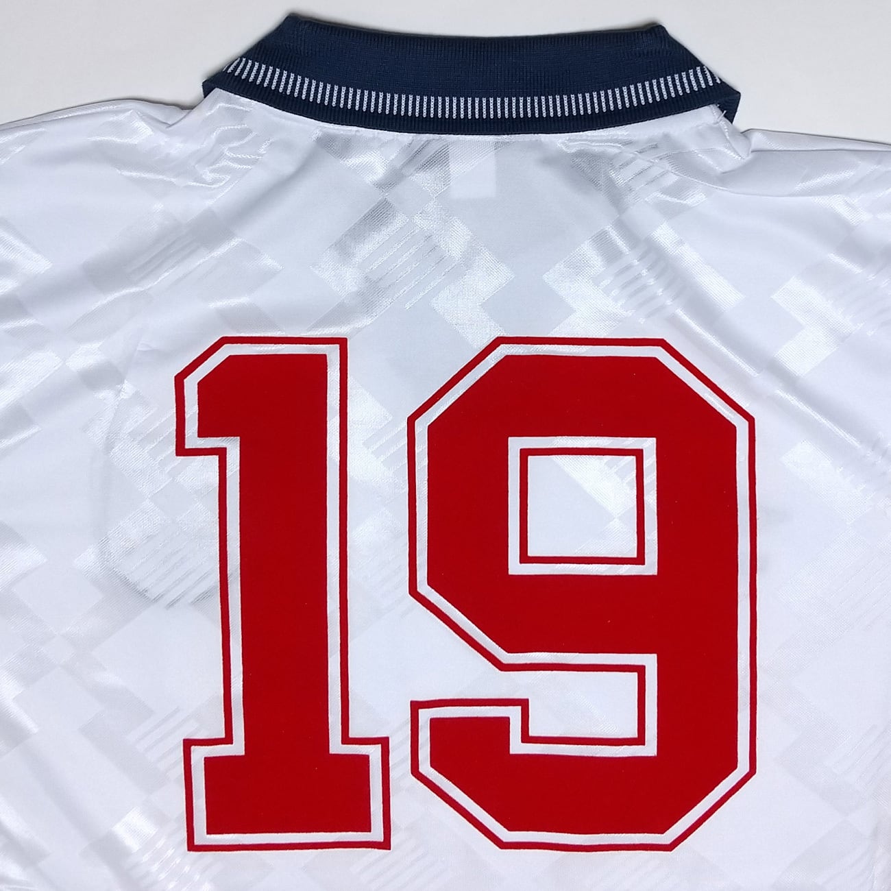 ユニフォームにはフロッキー素材で背番号19をプリント。90イタリアW杯で19番を背負ったのは、“ガッザ”の愛称で人気者だったポール・ガスコインで、当商品はその「ガスコイン・モデル」となります。