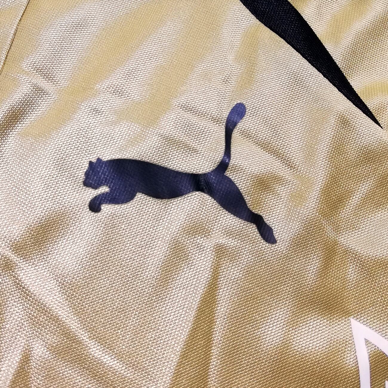 特別感が漂うブラック仕様のエンブレムはワッペン縫い付け。右胸と両肩のPumaキャットロゴはラバー素材。胸スポンサー「Gazprom」もラバー。