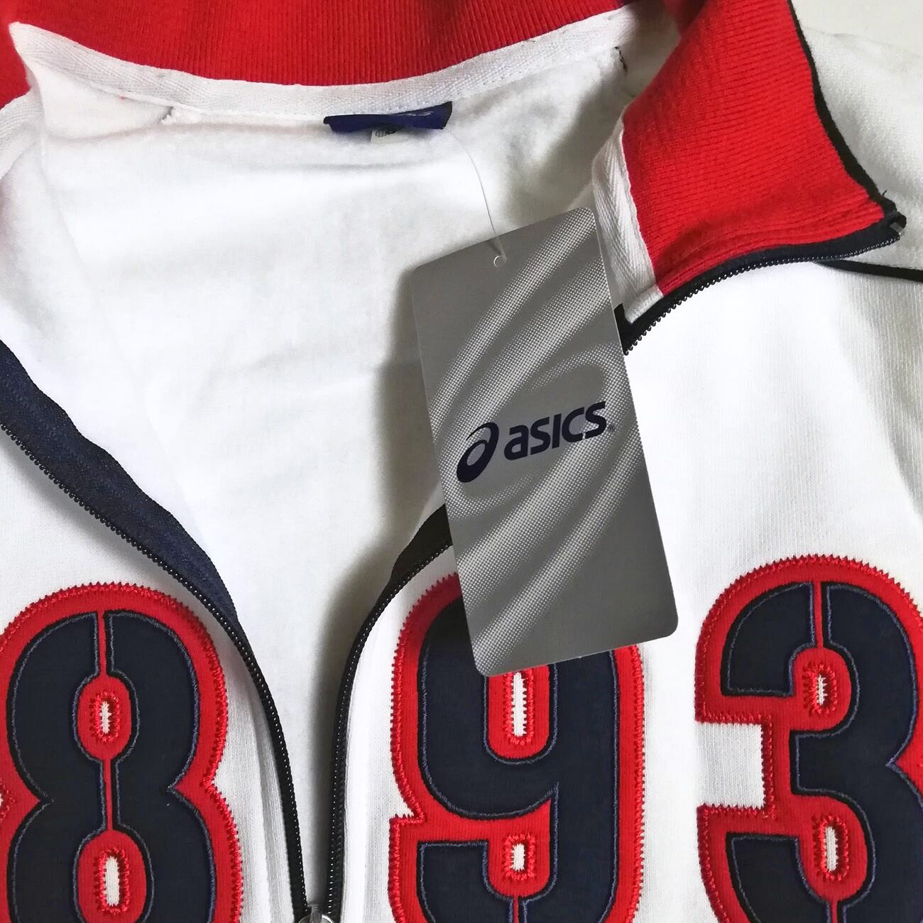 右袖のAsicsロゴは刺繍。左袖のチームエンブレムはワッペン縫い付け。